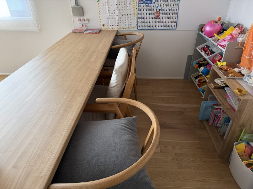 ダイニングで子供用のチェアを使っているため、ダイニングテーブル用の余った大人用チェアを3脚置いています。
